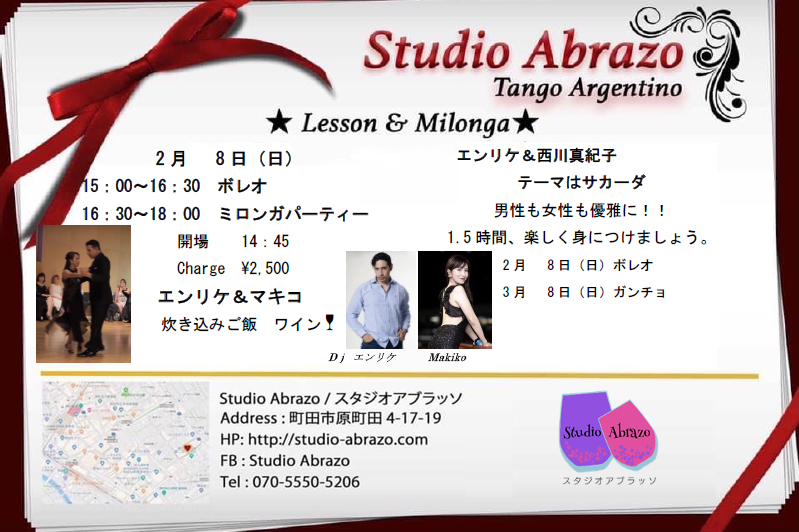2026年2月8日11:40: Basic Group11:40: Basic Group15:00: Lesson&Milonga エンリケ15:00: Lesson&Milonga エンリケ |
