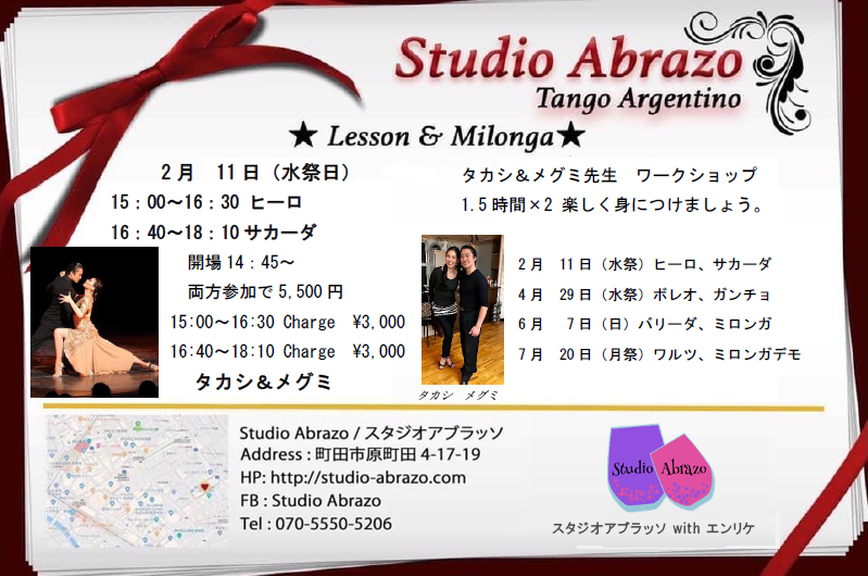 2026年2月9日 | 2026年2月10日 | 2026年2月11日15:00: Lesson&Milonga 高志&めぐみ15:00: Lesson&Milonga 高志&めぐみ |